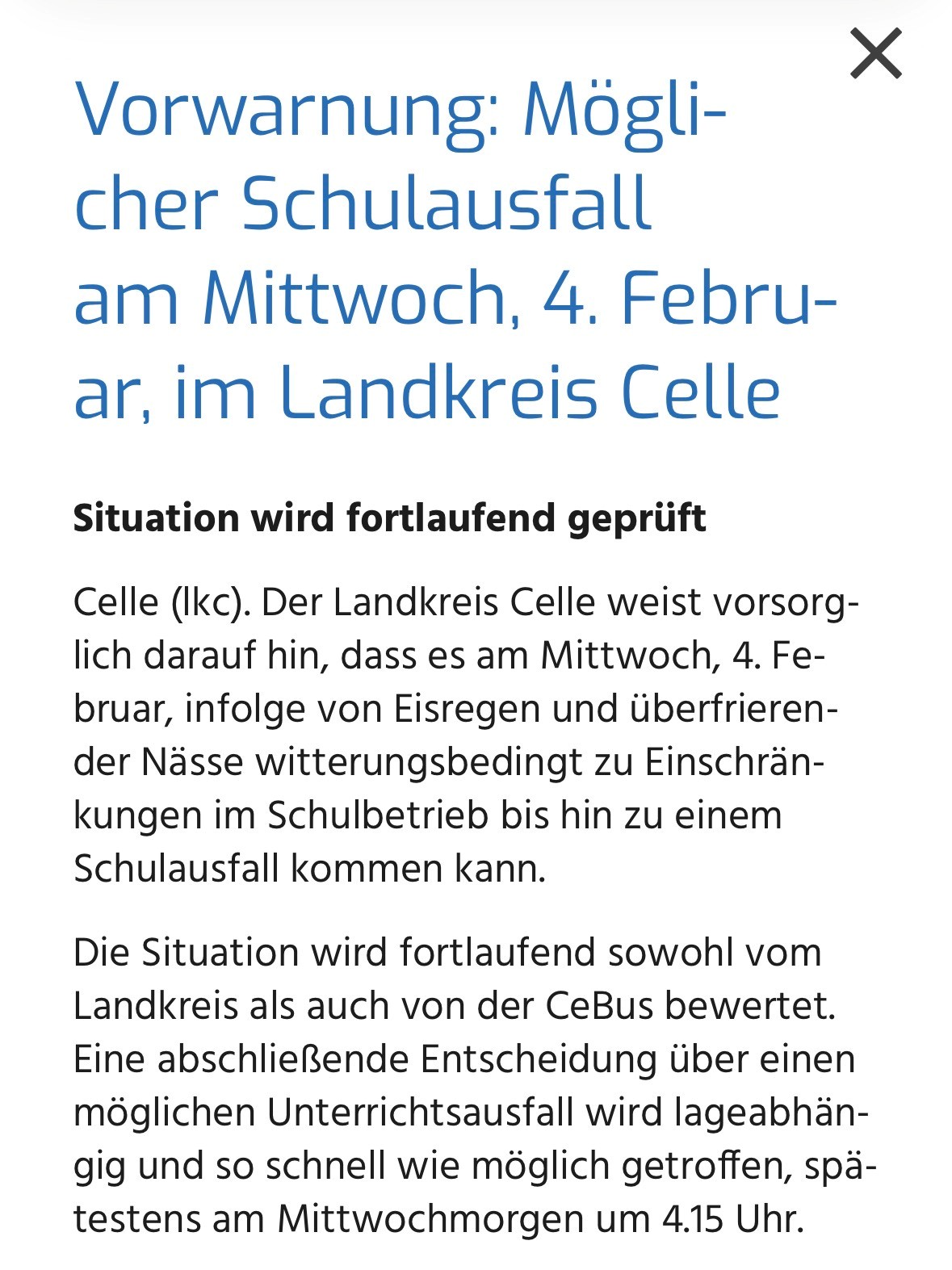 Landkreis Celle meldet: möglicher Schulausfall 4.2.2026